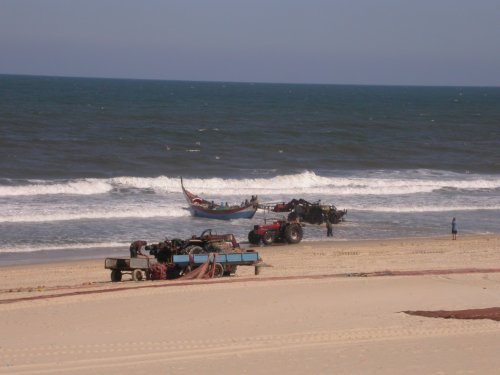 Deixando uma das pontas da corda em terra, os pescadores lançam a rede entre 500 a 1500 metros da costa e regressam com a outra ponta.